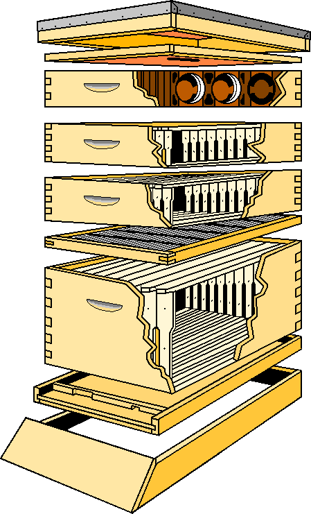 Langstroth also found that several communicating hive boxes can be stacked one above another and that the queen can be confined to the lowest (or brood) chamber, by means of a queen excluder. In this way, the upper chambers can be reached only by the workers, and therefore contain only honey-comb. This made hive inspection and many other management practices possible, and turned the art of beekeeping into a full-scale industry. At the time of Langstroth’s contributions, honey was the chief sweetener in American diets, so Langstroth’s new beekeeping techniques were of great importance. His discoveries and inventions allowed beekeeping to be done more cost-effectively on a large scale. Since four to twelve pounds of honey—in addition to many hours of bee time—are consumed by bees in the production of one pound of beeswax, honey production was increased from reuse of the comb.